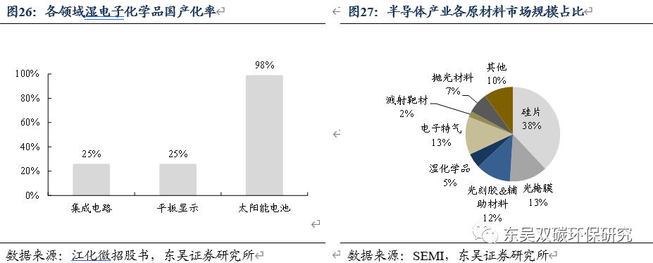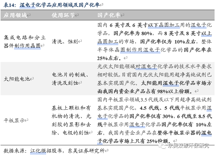 集成电路领域湿电子化学品洁净度要求最高,国产化率待提升。根据智研咨询数据,2021年我国湿电子化学品行业市场规模为131亿元;需求量约102.4万吨,集成电路/液晶显示/光伏领域湿电子化学品需求量占比分别21.5%/30%/41.7%,光伏领域是目前国内湿电子化学品市场主要需求领域。从纯净度要求和提纯工艺要求来看,半导体>显示面板>光伏;太阳能电池领域仅需要达到G1等级、显示面板领域一般要求达到G2、G3等级,集成电路领域8英寸及以下晶圆要求达到G3、G4水平,12英寸晶圆需要达到G5等级;这也导致了湿电子化学品在集成电路和平板显示领域国产化率仅为25%,低于太阳能电池的98%。在半导体领域中,湿电子化学品的市场占到整体原材料市场的5%,是重要的耗材;我国半导体和显示面板领域湿电子化学品国产化率仍待提升。
