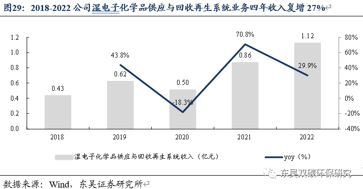 公司借助行业经验客户积累纵向延伸至湿电子化学品领域,2018-2022四年收入复合增速27%。凭借着在国内泛半导体行业积累的优质客户资源和服务口碑,公司深度挖掘客户需求,逐步进入泛半导体湿电子化学品供应与回收再生系统服务领域;湿电子化学品供应与回收再生系统包括两个相关联化学品系统,即化学品供应系统和化学品回收再生系统。2017年,公司设立子公司北京盛科达,专注于湿电子化学品供应与回收再生系统服务,实现产业价值链纵向延伸。2018年起,公司陆续为京东方、奕斯伟、和辉光电等客户提供了湿电子化学品供应与回收再生系统产品和服务。2022年8月,北京盛剑微、上海盛剑微就适用于FPD的剥离剂和蚀刻液,与长濑化成株式会社达成技术使用合作;同时,在合肥新站高新区投建并推进“上海盛剑电子专用材料研发制造及相关资源化项目”;公司已基本具备生产条件,并已经启动面板行业客户的光刻胶剥离液送样工作。2018-2022年,公司湿电子化学品供应与回收再生系统业务稳定发展,2018-2022年,四年收入复合增速27%。