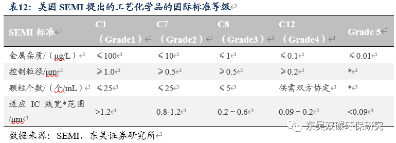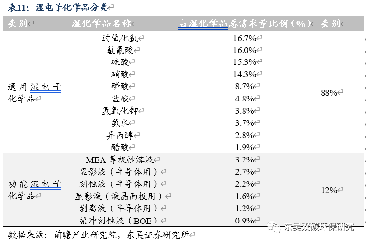 湿电子化学品用于泛半导体领域(晶圆、显示面板、太阳能电池),为制程刚性需求。湿电子化学品是电子湿法工艺中使用的各种电子化工材料,是指主体成分纯度大于 99.99%,杂质和微粒数符合严格要求的化学试剂。其主要应用于泛半导体领域(晶圆、显示面板、太阳能电池),制造加工过程中的清洗、刻蚀等湿法工艺制程。湿电子化学品种类繁多,按照构成成分和应用工艺不同,可分为通用湿电子化学品(占比88%)和功能性湿电子化学品(占比12%)。为了适应电子信息产业微处理工艺技术水平不断提高的趋势,并规范世界超净高纯试剂的标准,国际半导体设备与材料组织(SEMI)将超净高纯试剂按金属杂质、控制粒径、颗粒个数和应用范围等指标制定国际等级分类标准,共分为G1-G5五个标准。在半导体生产过程中,大规模集成电路工艺有几十道工序,工艺制造过程中的各种因素都可能带来污染物,而这些污染物都需要相关的超净高纯试剂去除,否则超过一定限度后就会使集成电路产品发生表面擦伤、图形断线、短路、针孔、剥离等现象,严重时可导致电路报废,湿电子化学品为制程刚性需求。