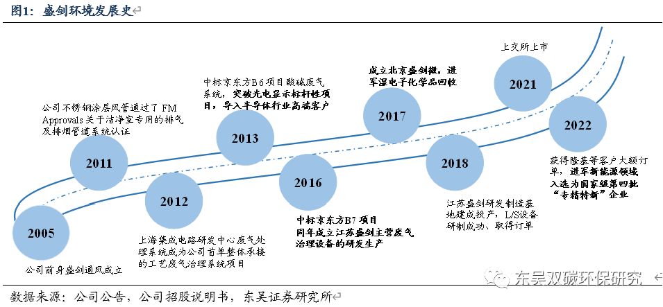 深耕泛半导体废气治理,纵横拓展构建多元驱动力。公司成立于2005年,前期主要以制造、销售镀锌及不锈钢材质的螺旋和焊接工艺排气管道为主。2012年,公司中标上海集成电路研发中心废气处理系统,正式进军泛半导体工艺废气治理领域,此后,持续拓展客户,服务于京东方、华星光电、天马微电子等业内领军企业。公司在奠定国内泛半导体工艺废气治理领先地位的同时,依托深厚行业积累持续拓展,逐步实现废气治理系统、废气治理设备、湿电子化学品供应与回收等多元业务格局。