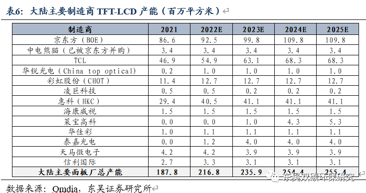 全球TFT-LCD面板产能向中国大陆转移,大陆主要面板产线2021-2025年四年产能复合增速8.0%。IHS数据显示,全球TFT-LCD产值自2016年起维持在1250-1400亿美元之间,进入存量市场阶段。韩国厂商先后宣布退出LCD进而转向OLED;以京东方和华星光电为首的中国大陆面板厂商增加TFT-LCD产能,同时加快进军高世代生产线;全球TFT-LCD产能聚集中国大陆。2020年我国TFT-LCD产能已经位居全球第一,中国大陆占据全球50%的产能。根据DSCC的预测,全球面板设备资本开支2024年为83亿美元,由于大陆产能转移的持续进行,我们可以认为大陆的面板设备资本开支2024年为折合83亿美元(581亿人民币,汇率为7)。根据Odmia的数据,大陆面板厂在2025年前仍在扩产。大陆面板制造商通过扩建自身产线或收购其他国家生产线并转移到国内的方式继续扩大大陆面板产能,产能将从2021年的187.8百万平方米,增长至2025年的255.4百万平方米,2021-2025年四年产能复合增速8.0%。