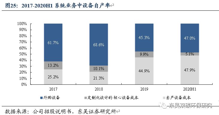系统业务中的设备自产比提升,采购成本进一步降低。公司废气治理系统中的核心设备来源分为外购、定制化设计及制造及自产,主要核心设备已经能够实现自产或定制化设计。2018下半年,随着江苏盛剑厂房建成投产,单体治理设备产能大幅提升,项目采用公司自产设备的比例和种类都有所增加;2019年度起废气治理系统中的设备自产化程度大幅上升;到2020H1,公司废气治理系统中自产设备/定制化设计的核心设备成本占比已达到47.9%/5.1%。设备自产比例提升,成本进一步优化。