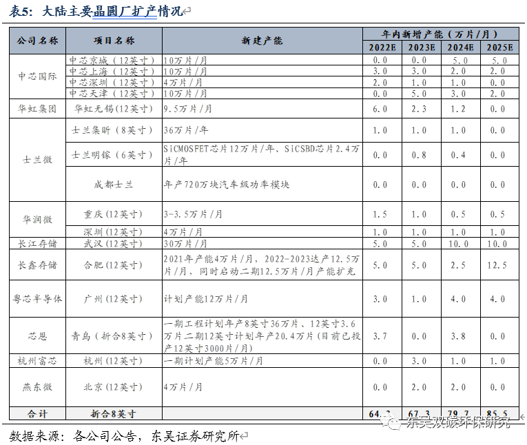 全球晶圆厂资本开支强劲,大陆主要晶圆产线2021-2025年四年产能复增16.6%。2018年-2022年全球晶圆厂资本开支力度逐年增加,2022年达613亿美元;据Gartner预测,2022-2025年仍将将维持在500亿美元以上。从扩产节奏来看,全球晶圆厂仍处于扩产周期。根据SEMI预测,2025年全球晶圆厂产能将达到228万片/月(约当8英寸),2022-2025年产能CAGR9.6%。国内各大晶圆厂仍处于扩产周期,在2025年前仍在进行产线扩建。根据我们的统计,至2025年底,头部晶圆厂的产能距2021年新增296.9万片/月(约当8英寸)。2021-2025年大陆晶圆产能复合增速16.6%。