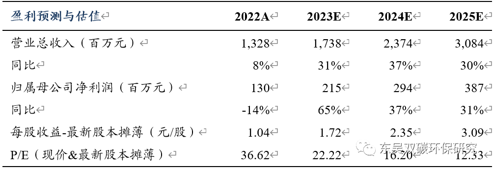 公司已经在半导体面板废气治理领域具备一定行业地位,基于积累的行业经验及客户资源拓展至新能源下游领域并切入湿电子化学品供应与回收再生业务。在国产化趋势下,公司市占率有望快速提升,我们预计公司2023-2025年收入为17.38/23.74/30.84亿元,同比增速31%/37%/30%;归母净利润2.15/2.94/3.87亿元,同比增速65%/37%/32%,对应EPS 1.72/2.35/3.09元,PE 21/15/12倍(估值日期2023/5/16),首次覆盖,给予“买入”评级。