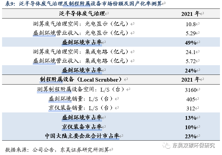 2030年国产废气治理系统/设备空间71/55亿元,2023-2030年七年复合增速32%/28%。国内泛半导体废气治理设备长久以来由中国大陆以外供应商垄断,相关优势企业来自美国、德国、日韩、中国台湾等。当前国内供应商凭借快速发展的研发设计水平和优质的服务,正快速实现突破,收入利润规模快速提升,核心具备竞争优势公司包括盛剑环境、京仪装备等。经过我们梳理测算,1)泛半导体废气治理系统:盛剑环境正快速推动行业国产化率提升,我们预计2021年盛剑环境于光电显示/集成电路市占率分别为49%/24%,正积极推动集成电路废气治理国产化率提升;2)制程附属设备:中国大陆主要参与企业包括盛剑环境、京仪装备,我们预计2021年盛剑环境/京仪装备于制程附属设备(Local Scrubber)市占率分别为13%/10%,制程附属设备整体国产化率约23%。结合《中国制造2025》中提出的70%自产目标以及当前废气治理系统/设备的国产化率,我们假设2023年/2030年,集成电路废气治理系统、面板废气治理系统、工艺废气治理设备的国产化率分别达到30%/70%、55%/90%、30%/70%,对应2030年国产废气治理系统/设备空间71/55亿元,2023-2030年七年复合增速32%/28%。泛半导体废气治理已具备国产替代基础,国产替代节奏加快,带动下游空间快速释放。公司光电显示领域废气治理市占率近50%,高市占率有望复制到集成电路;集成电路领域废气治理系统设备市占率有望随国产化进行而快速提升。