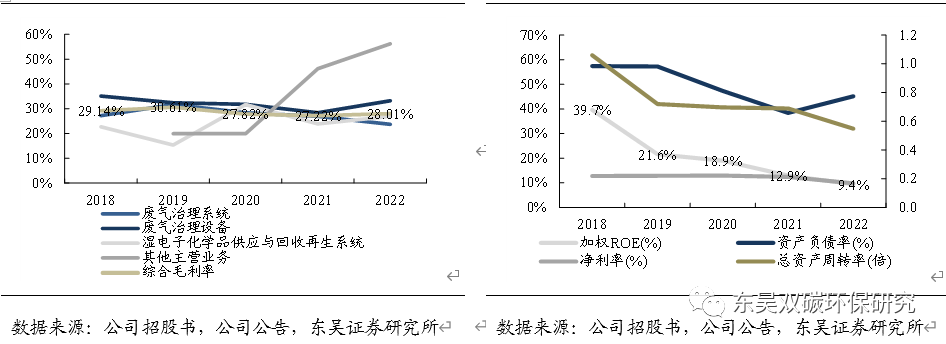公司综合毛利率较为稳定,ROE有望回升。2018-2022年,公司综合毛利率在27%-31%之间呈现窄幅波动趋势,较为稳定。细分来看,系统和设备业务毛利率小幅波动;湿电子化学业务过往采取价格策略开拓市场,毛利率有所波动,2022年毛利率提升3.06pct至26.90%,未来随着该业务持续放量,毛利率有望继续提升。2018-2022年公司ROE持续下滑;拆分来看,费用良好管控下公司净利率较为稳定,下滑主要系公司资产负债率的下降叠加营收端增速放缓导致资产周转率下降所致。展望未来,公司收入端放量有望带动周转率企稳回升;2022年,公司杠杆率已企稳回升,ROE有望提高。