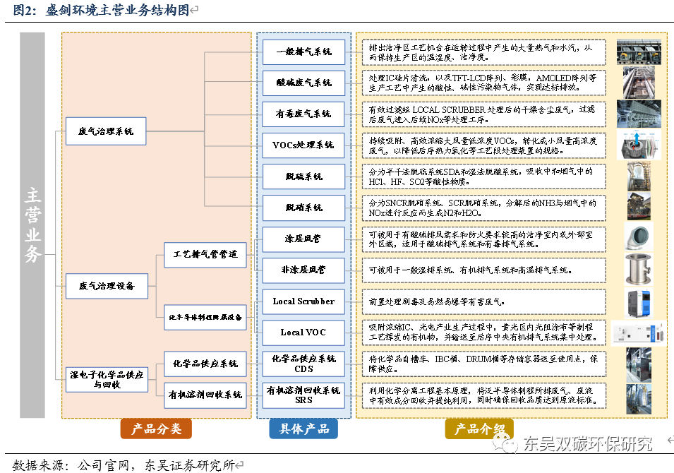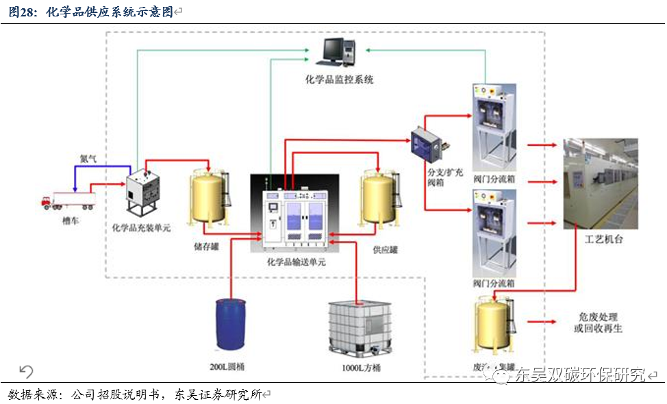 构建“系统、设备、材料”多元产品体系,具备一体化优势。公司在持续巩固泛半导体工艺废气治理系统的领先地位的同时,稳步打造“工艺废气治理系统(中央治理)+制程附属设备(源头控制)”、“湿电子化学品供应系统+湿电子化学品回收再生系统+电子材料研发制造”的多产品矩阵。公司可处理各类废气,包括酸碱废气、有毒废气、VOCs等,同时涉及附属设备及排气管道配套部件的销售;挖掘现有客户需求,开展湿电子化学品供应和回收业务,具备一站式服务优势。