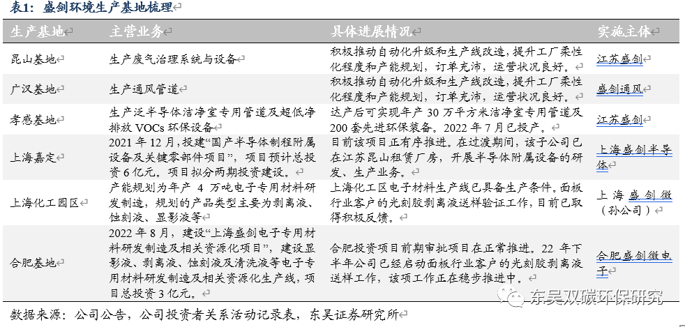 制造基地多点布局,强化属地化配套优势。公司的江苏昆山基地、四川广汉基地为成熟运营的基地,公司积极推动自动化升级和生产线改造,提升工厂柔性化程度和产能规划,目前订单充沛,运营良好。湖北孝感基地于 2022 年 7 月投产,废气治理设备产能逐步释放。基地规划方面,公司将江苏盛剑、孝感盛剑等共同打造为绿色装备智能制造中心;加快打造上海盛剑半导体先进泛半导体制程附属装备平台;加速推动盛剑微化学品材料生产、研发基地(上海化工区、合肥)建设。产能端多地多元有序建设扩充,匹配下游市场需求和客户订单,持续优化业务结构,增强客户服务能力与粘性,为公司后续发展提供保障。