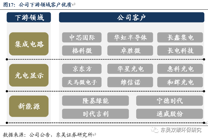 优质客户资源为公司业务发展持续助力。公司通过多年深耕,积累了优质的客户资源。公司在集成电路行业的主要终端客户包括中芯国际、华虹半导体、长鑫集电(北京)、格科微、卓胜微、长电科技等知名企业;光电显示行业客户包括京东方、华星光电、惠科光电、天马微电子、维信诺、和辉光电等;新能源行业客户包括隆基绿能、宁德时代、通威股份等龙头。公司产品对于客户产线的安全稳定运行至关重要,如果出现故障可能会导致客户停产,甚至造成重大经济损失。因此客户倾向与优质供应商形成长期合作关系。优质稳定客户资源为公司持续发展提供重要支撑。