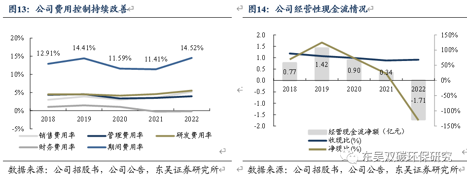 费控效果较好,经营现金流有望转好。2018-2022年公司期间费用率始终控制在11%-15%,费用管控效果较好,2022年期间费率14.5%,主要系开拓业务、支付员工薪酬以及售后维护费及加大研发投入所致,未来受益经营规模效应,期间费率仍有望下降。2019年后疫情导致下游客户账期延长,叠加原材料价格上涨等因素影响,公司经营现金流净额持续下滑,收现比、净现比亦持续下降;展望未来,2023年疫情影响消除,经营现金流有望迎来改善。
