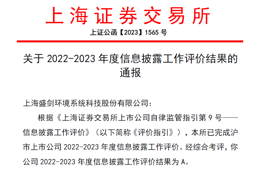 近日,上海证券交易所(以下简称“上交所”)公布了沪市上市公司2022至2023年度信息披露工作评价结果,盛剑环境(证券代码:603324)荣获上交所信息披露工作最高评价A级(优秀)。
