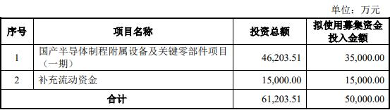 公司本次向不特定对象发行可转债拟募集资金总额不超过人民币50,000.00万元(含),扣除发行费用后募集资金净额将用于国产半导体制程附属设备及关键零部件项目(一期)、补充流动资金。