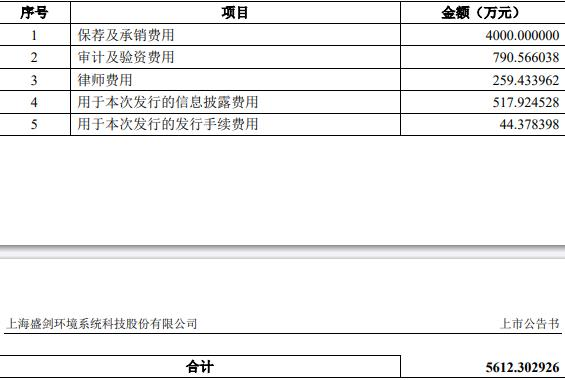 盛剑环境上市发行费用为5612.302926万元,其中保荐机构海通证券获得保荐及承销费用4000.00万元。