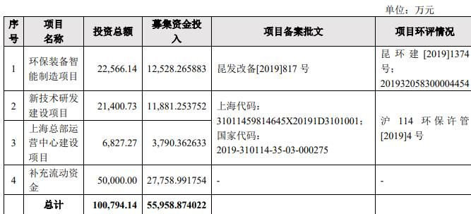 盛剑环境上市募集资金总额为61,571.176948万元,扣除发行费用后,募集资金净额为55,958.874022万元。公司2021年3月19日发布的《首次公开发行股票招股说明书》显示,公司计划募集资金55,958.874022万元,分别用于环保装备智能制造项目、新技术研发建设项目、上海总部运营中心建设项目、补充流动资金。