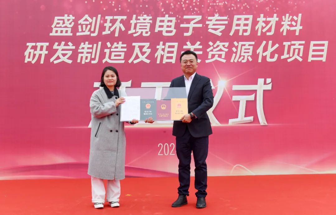 随后,新站高新区党工委委员、管委会副主任安志强宣布盛剑环境电子专用材料研发制造及相关资源化项目正式开工。在热烈的掌声、礼炮声和缤纷的彩花中,新站高新区党工委委员、管委会副主任安志强,盛剑环境董事长、总经理张伟明等领导同擎金锹,为项目开工奠基培土。