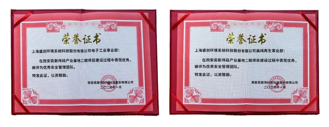 近日,上海盛剑环境系统科技股份有限公司在西安奕斯伟硅产业基地二期项目中荣获“优秀安全管理团队”称号。获得这一荣誉是西安奕斯伟材料科技股份有限公司对盛剑环境团队凝聚力、综合实力的高度认可,客户的认可是公司持续提供优质服务、为客户创造价值的不竭动力。面对工期紧、任务重等诸多挑战,盛剑环境全体项目人员齐心协力,尽职尽责、积极主动、协调推动各项工作有序开展,强化安全质量管理,发挥团队凝聚力。