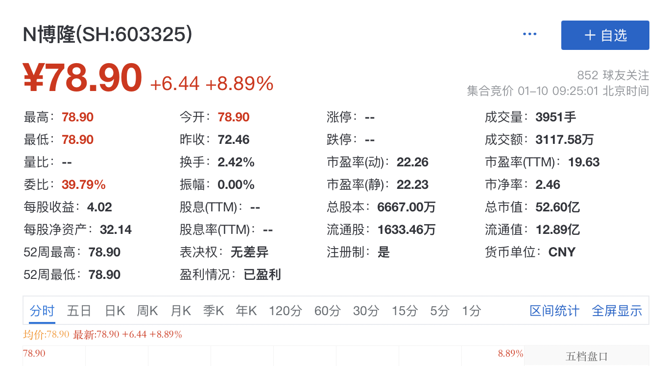 1月10日,博隆技术登陆上交所主板,其开盘报78.9元,涨8.89%,总市值约52.6亿元。