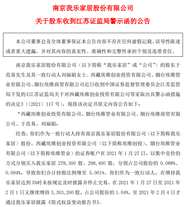 经查,上述自然人和公司主体作为一致行动人持有南京我乐家居股份。西藏埃维创业投资有限公司、烟台埃维管业有限公司的证券账户在2021年1月27日,以集中竞价的方式分别买入我乐家居278,300股、298,400股,分别占公司股份的0.088%、0.094%,导致合计持股比例增至 5.001%。作为一致行动人,在增持我乐家居达到5%时未按规定及时披露并停止交易,在2021年1月27日至2021年2月1日又继续增持3,303,260股,占公司股份的1.04%,至2021年2月4日才通过我乐家居披露《简式权益变动报告书》。