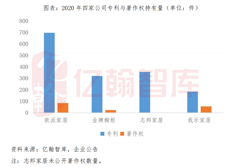 尽管公司大力发展自身产品与品牌实力,但在定制家居行业中我乐家居并没有相对的优势。系列产品数量方面,我乐家居27款厨柜产品与35款全屋产品,不及志邦家居56款厨柜产品与65款全屋产品。与公司市值较为接近的好莱客在官网中有27款橱柜产品与30款全屋产品,以厨柜产品见长的金牌厨柜已经积累了104款厨柜产品。专利设计方面,2020年行业龙头欧派家居共有696件专利权、84件软件著作权,远超我乐家居所拥有的数量。同时2020年金牌厨柜持有实用新型专利178件、外观专利135件、软件著作权23件,志邦家居拥有实用新型专利232件、外观专利107件,均超过我乐家居。