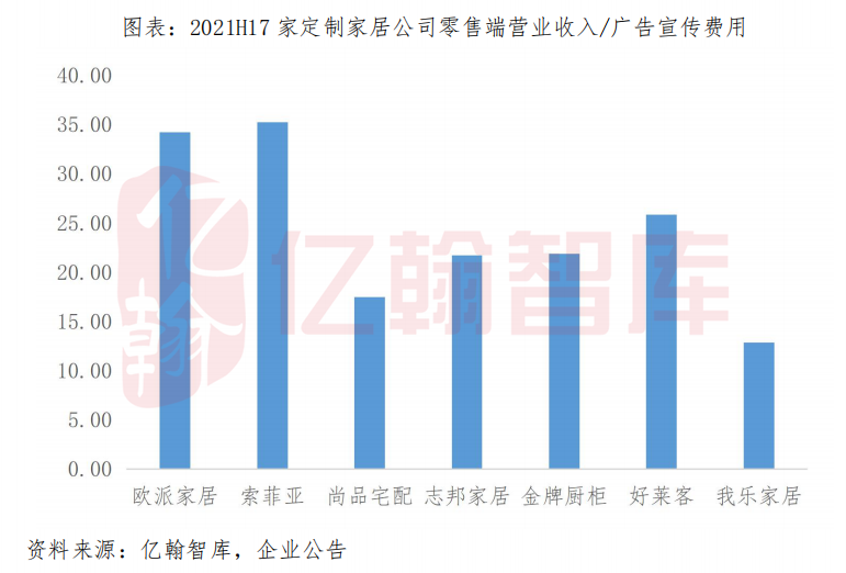 另外在品牌宣传上,虽然品牌推广效果难以衡量,但以公司零售端营业收入/广告宣传费用支出(广告宣传费用=广告费+业务宣传费)的数值进行对比,在广告创造的营业收入效益上,我乐家居排行靠后。2021H1我乐家居广告宣传费用支出4305万元,同比增长77.9%,零售端营业收入/广告宣传费用为12.8。而行业中营业收入前三的欧派家居、索菲亚、尚品宅配分别支出了1.9亿元、9997万元以及1.8亿元广告宣传费用,零售端营业收入/广告宣传费用分别为34.2、35.3、17.5,我乐家居与这三家行业前排公司的差距较大。行业里与我乐家居市值规模相近的企业中,好莱客、金牌橱柜分别为25.8、21.9,均高于我乐家居。在广告宣传上我乐家居虽然费用支出增长较快,但是广告宣传费用所创造的收入效益较差,与其他公司没有相对优势。