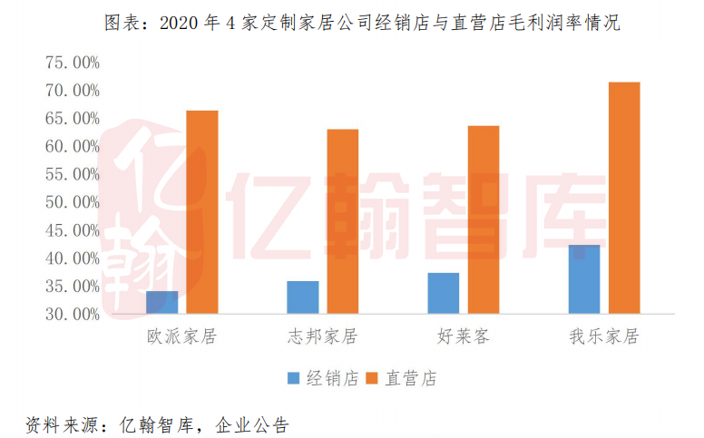 目前,我乐家居零售渠道产品毛利润率处在行业前列。2020年经销门店的毛利润率为42.31%,直营门店的毛利润率为71.43%,2021H1经销门店的毛利润率为40.03%,直营门店的毛利润率为70.08%。相比同行,2020年欧派家居经销门店的毛利润率为34.06%,直营门店的毛利润率为66.36%;志邦家居经销门店的毛利润率为35.84%,直营门店的毛利润率为63%。
