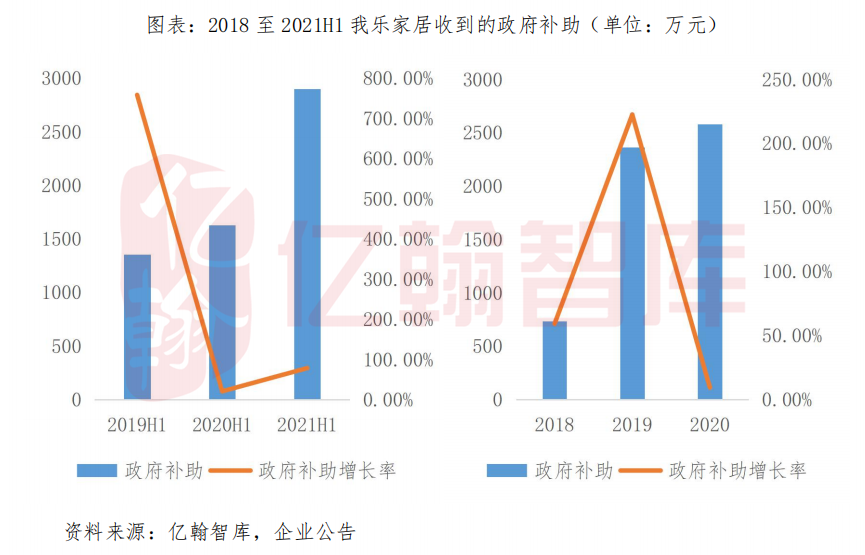 值得注意的是,2021H1我乐家居的净利润较为依赖政府补助。2021H1我乐家居计入当期损益的政府补助合计2898万元,占净利润总额的55%。2020H1公司计入当期损益的政府补助为1627万元,占净利润总额的34%,2019H1政府补助占净利润的30%,我乐家居依赖政府补助的程度在不断提升。若去除政府补助对净利润的影响,2020H1公司实际净利润为3109万元,2021H1为2355万元,同比下滑23.26%。政府补助在公司上半年业绩中占比较大,在全年业绩中占比有所回落,政府补助2019年占净利润15.33%,2020年占净利润11.74%,下降3.59个百分点。但相对于2017、2018年5.5%以及7.2%的占比,公司整体对于政府补助的依赖程度有一定的上升。