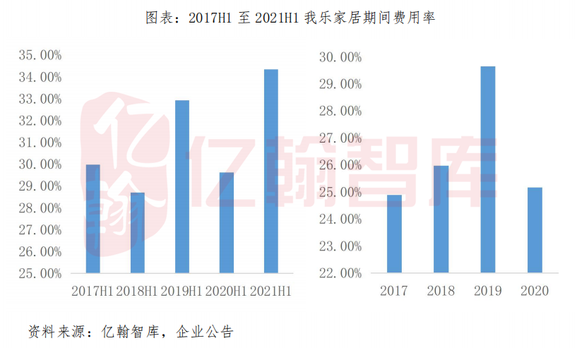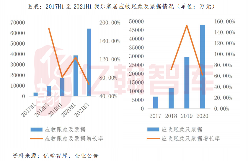 大宗工程上,由于公司两家主要工程客户——中国恒大与华夏幸福的财务状况堪忧,公司应收款项的兑付存在重大不确定性,公司高管是否会转变对继续大力拓展大宗业务的态度值得关注,2021H1大宗业务营业收入增速已经下滑。预计我乐家居大宗业务将维持两位数增长,但增速较2019、2020年将有明显回落。