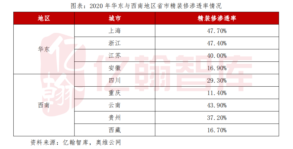 2017年全国精装修政策逐步推广,我乐家居受益于相关政策。公司大宗工程业务主要集中于华东与西南地区,两个地区包含了上海、成都、南京等精装渗透率较高的一二线城市。此外,江苏省与四川省都曾设立过至2020年新建住宅全装修比例达到50%的目标。截止2020年,上海精装渗透率为47.7%,浙江为47.4%,江苏为40.9%,四川为29.3%,江苏与四川省都还有一定程度的增长空间。华东与西南地区的杭州、成都、苏州、南京等城市是2020年精装修规模排行前列的城市。