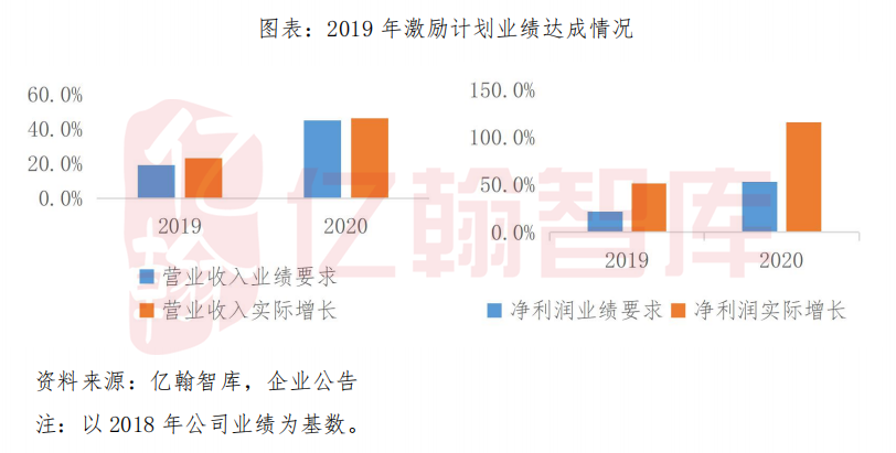 由于2017年扣非净利润实际增长21.72%,未能达到30%的业绩考核目标,导致2017年的激励计划在2018年提前终止。2019年的激励计划较2017年降低了营业收入和归母净利润的增长要求,第一年解除限售条件从营业收入和归母净利润同时增长30%降至营业收入增长19%、归母净利润增长22%。截止2021年,2019年激励计划进展顺利,2019年和2020年的业绩目标均已完成。其中2019年归母净利润同比增长51%,2020年较2018年增长116%,大幅超过2019年22%、2020年53%的业绩目标。2019年和2020年的营业收入较2018年分别增长23.1%和46.4%,略高于激励计划所设目标。