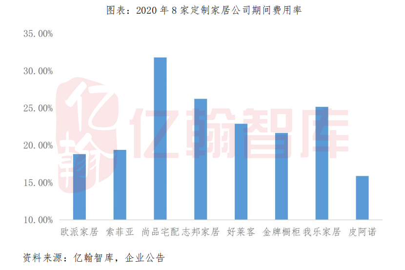 在全行业中,我乐家居的期间费用率处在较高的水平。2020年欧派家居期间费用率为18.81%,索菲亚为19.39%。8家定制家居上市公司中仅尚品宅配与志邦家居的期间费用率超过我乐家居,两家公司的期间费用率分别为31.81%与26.25%。造成我乐家居期间费用率过高的主要原因是由于公司销售费用过高,占期间费用的比重达到70%以上。公司在近三年时间不断发展地方直营店,相关员工薪酬以及店面租赁费用的快速增长导致了公司销售费用的提升,进而影响了公司净利润率情况。