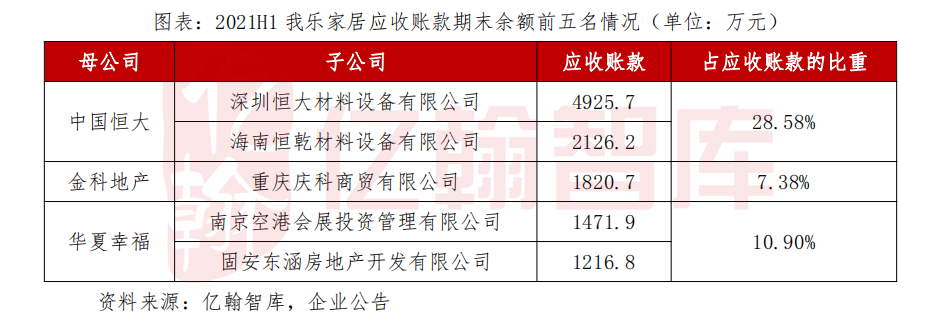 2021H1我乐家居应收账款前五名中,有两家中国恒大的子公司以及两家华夏幸福的子公司。中国恒大的应收账款占应收账款总额的28.6%,华夏幸福占比10.6%,两者合计应收账款总额为9741万元,占2020年净利润的44.37%。如果我乐家居在2021年计提中国恒大与华夏幸福的坏账,预计将严重影响2021全年利润,公司相关股权激励计划的目标达成也将存在极大的不确定性。