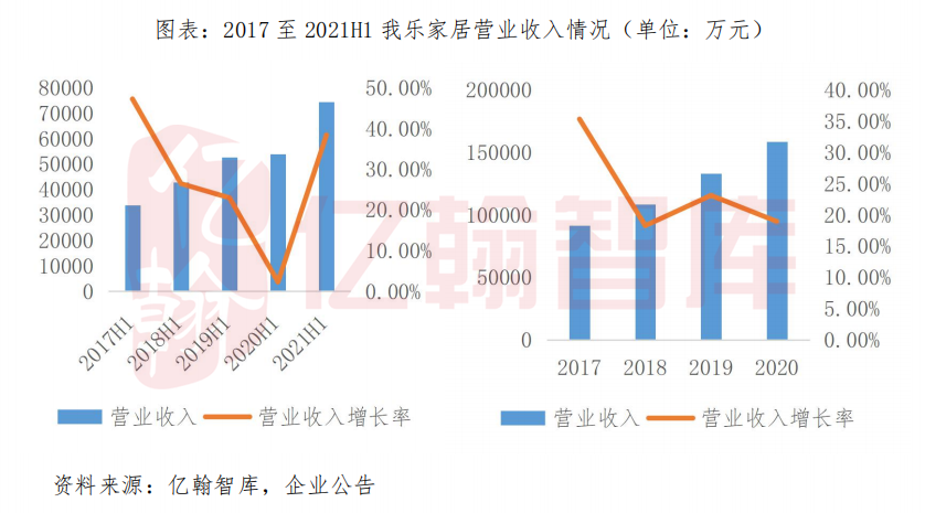 2021H1我乐家居实现营业收入7.45亿元,同比增长38.38%,较2019H1增长41.55%。归母净利润为5252万元,同比增长10.91%,较2019H1增长15.12%。自上市以来,我乐家居半年报与年报中披露的业绩情况表现靓丽,营业收入与归母净利润持续正增长,2019与2020年收入与利润的增长速度处在行业前排。