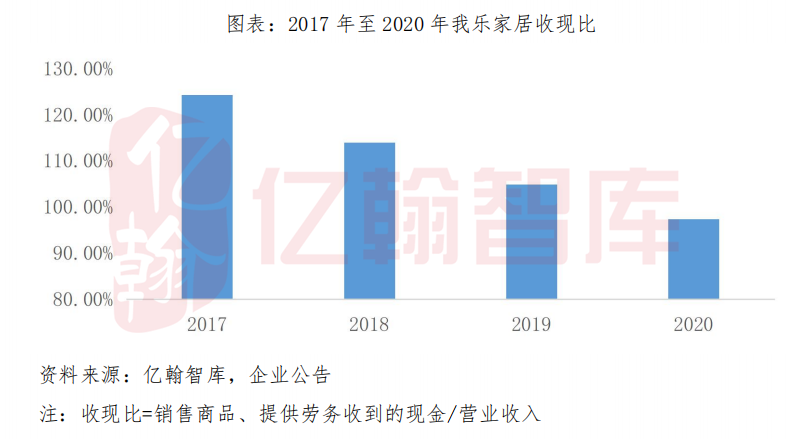 除了资产端,我乐家居的现金流状况同样较差,出现较大程度的下滑。2021H1我乐家居经营性净现金流为-8705万元,同比下滑413.8%。造成经营性现金流净额下滑的主要原因在于公司购买商品、接受劳务支付的现金增速过快。我乐家居现金流状况自上市以来便在持续恶化中。2017年经营性现金流净额为2.24亿元,2018年为1.32亿元,2019年为8614万元,2020年由于疫情影响,广告宣传费用等支出降低,经营性现金流流出总额减少,现金流净额达到2.19亿元,但收现比为97.35%,同比下滑7.46个百分点。2020年欧派家居收现比为112.48%,志邦家居为103.54%,好莱客为123.55%,我乐家居收现比在行业中处于中下的水平。2017至2020年现金流持续恶化的主要原因在于公司大宗业务逐步发展,回款周期变长,从公司应收账款周转情况来看,2017年应收账款周转天数为19.87天,此后每年增长,至2020年已达到44.96天。