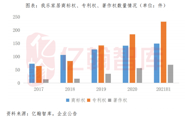 产品与品牌方面,公司持续扩大原创产品力,构建强势品牌力。产品力上,公司不断推出新品,近四年平均每年打造10款厨柜和全屋定制系列产品。2021上半年我乐家居官网中已经推出11款新品,超过2020年全年水平,目前公司官网累计有27款厨柜系列产品和35款全屋定制系列产品。同时我乐家居相对比较关注产品的原创专利设计。截止2020年末,公司共计拥有商标权141件、专利权184件、著作权56件。2021上半年新增专利权48件,产品著作权13件。