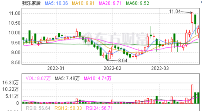 虽然,我乐家居的年度业绩表现不佳,但3月14日-16日,该公司的股价却无惧大盘的连续下行,持续逆势上扬。截止3月16日收盘,我乐家居股价上涨9.96%,报收11.04元/股。