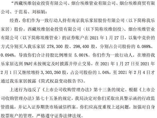 根据警示函内容显示,埃维创投、埃维管业的证券账户曾于2021年1月27日,通过集中竞价方式分别买入我乐家居股份27.83万股、29.84万股,分别占该公司股份比例0.088%和0.094%,至此,相关股东合计持股比例增至5.001%,超过5%,按规定应及时披露并停止交易。然而,前述股东并未遵守相关规定,而是在同年1月27日至2月1日期间又继续增持股份330.33万股,占比1.04%;这一权益变动则是于同年2月4日才进行披露。