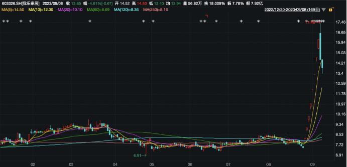 《投资时报》研究员注意到,今年以来,我乐家居股价一直徘徊在个位数,直至8月末才呈现出大幅拉升趋势。该股在连续8个交易日涨停后,于9月7日触及17.46元/股(按前复权计算,下同)高点,创下上市来股价新高。