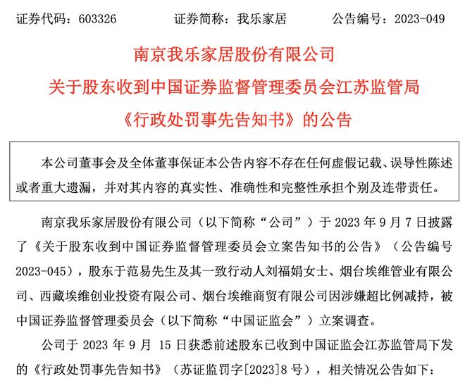 近日,按照党中央、国务院关于依法从严打击证券违法活动的总体要求,证监会对“我乐家居”大股东于范易及其一致行动人违规减持股票行为立案调查,迅速查明违法事实,从重从快追究行政法律责任,并向相关当事人送达了《行政处罚事先告知书》。