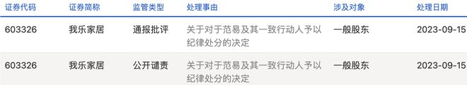 此外,上海证券交易所(简称“上交所”)对我乐家居股东于范易及其一致行动人刘福娟、烟台埃维管业有限公司(下称“埃维管业”)予以公开谴责,对西藏埃维创业投资有限公司(下称“埃维创业”)、烟台埃维商贸有限公司(下称“埃维商贸”)予以通报批评。