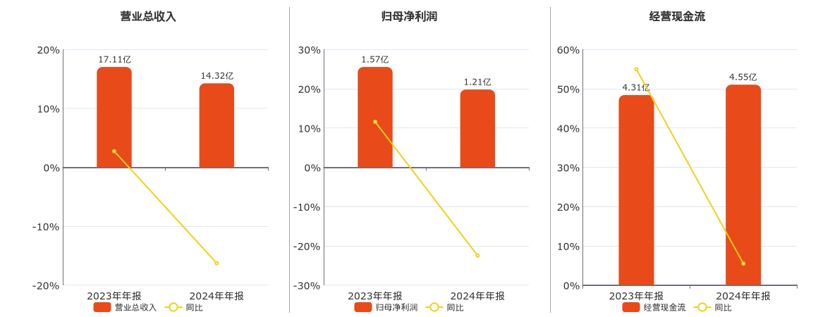 公司营业总收入为14.32亿元,较去年同报告期营业总收入减少2.79亿元,同比较去年同期下降16.29%。归母净利润为1.21亿元,较去年同报告期归母净利润减少3526.95万元,同比较去年同期下降22.50%。经营活动现金净流入为4.55亿元。