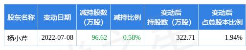 7 月 11 日苏州龙杰发布公告《603332:持股 5%以上股东集中竞价减持股份进展公告》,其股东杨小芹于 2022 年 6 月 30 日至 2022 年 7 月 8 日间合计减持 96.62 万股,占公司目前总股本的 0.5802%,变动期间该股股价上涨 9.09%,截止 7 月 8 日收盘报 23.4 元。