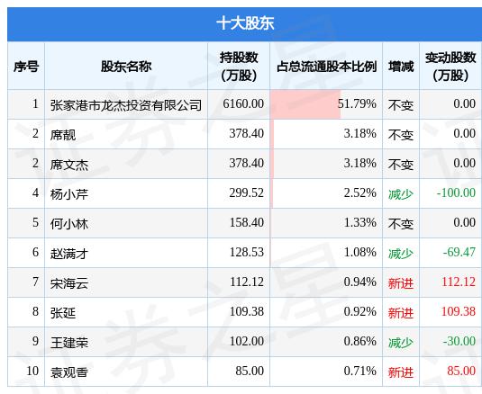 根据苏州龙杰 2022 年一季报公布的十大股东详情如下:
