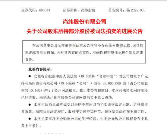 2025年3月4日盘后,尚纬股份有限公司(以下简称“尚纬股份”)发布关于公司股东所持部分股份被司法拍卖的进展公告。