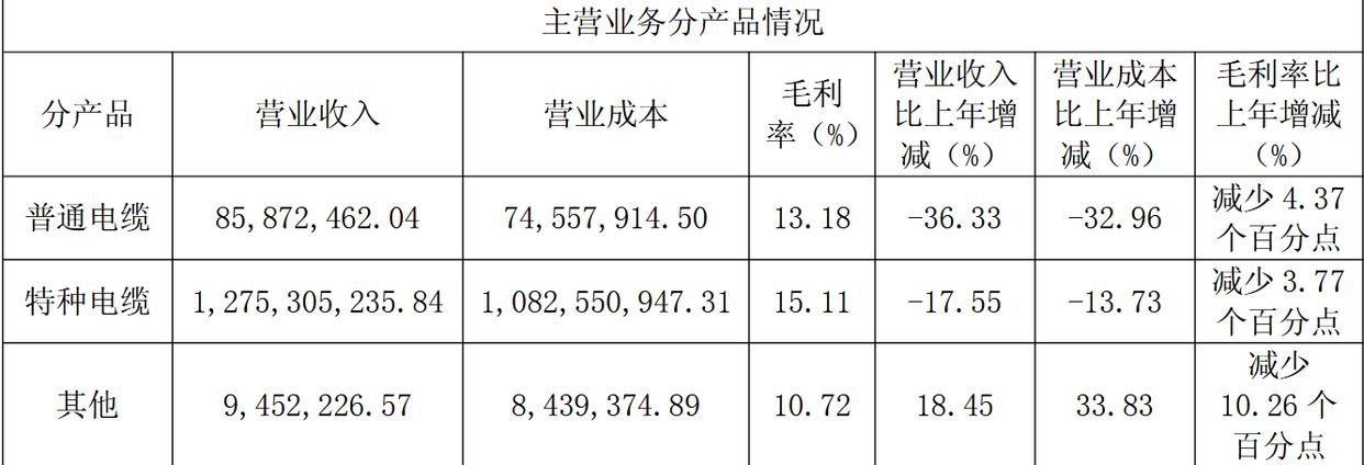 2025年,公司特种电缆业务收入由上年的15.47亿元下降至12.75亿元,普通电缆业务收入同比减少36.33%。作为核心盈利基石,主营板块的规模下降直接影响了公司的基本盘。
