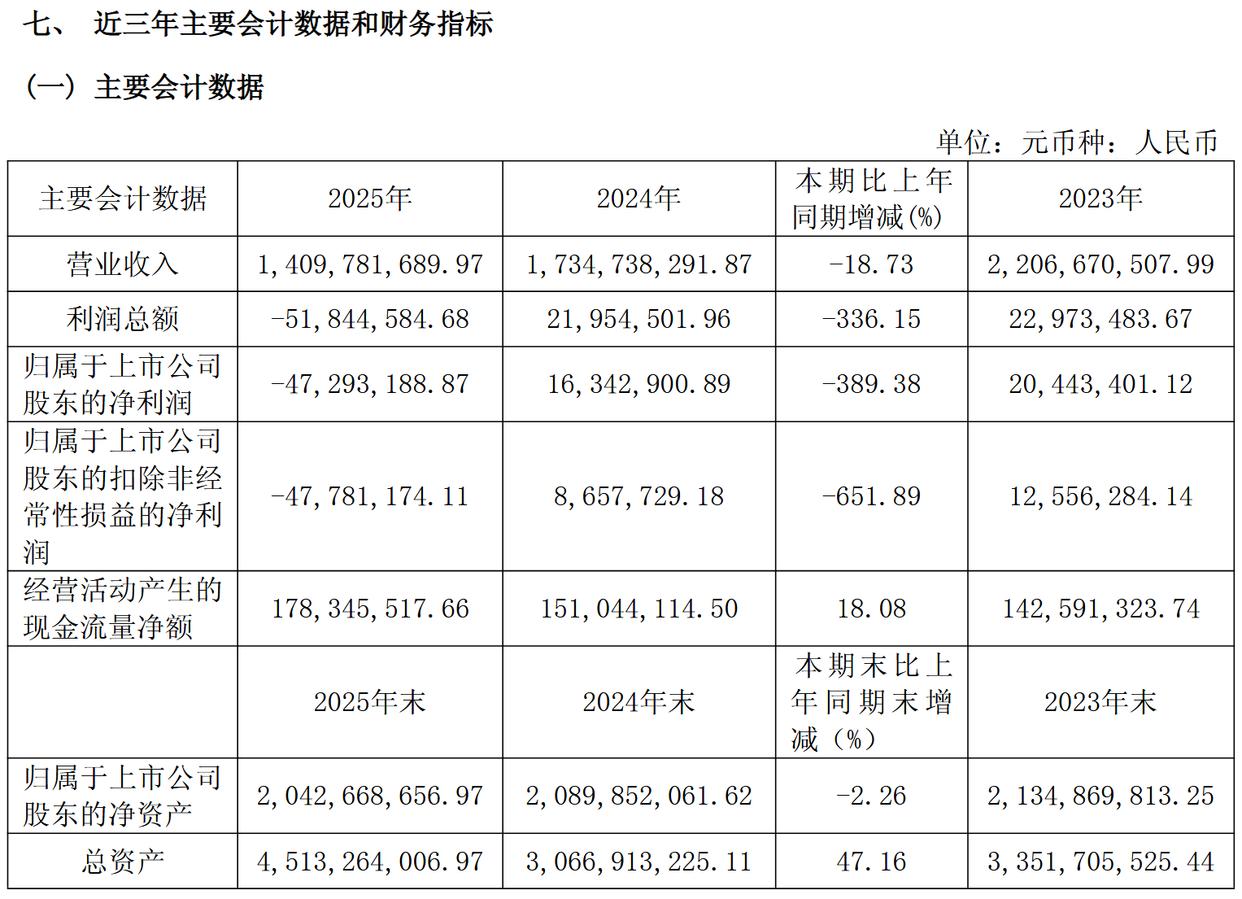 2026年3月,公司披露易主后的首份年度报告。2025年,公司实现营业收入14.10亿元,同比下降18.73%;归母净亏损4729.3万元,而上年同期为盈利1634.3万元。