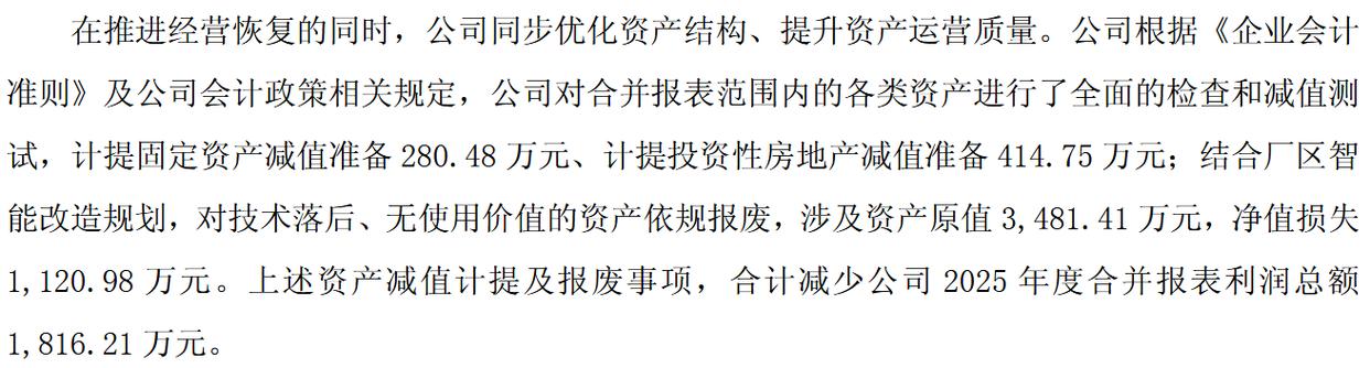 财报显示,尚纬股份在2025年末对固定资产及投资性房地产计提减值,并报废了部分技术落后设备,合计减少当期利润总额1816.2万元。这一安排在控制权更迭后的首个财年集中体现,使当期业绩承压更加集中。