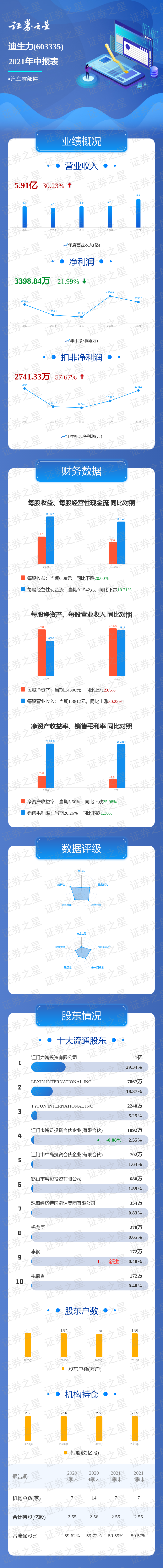 证券之星数据中心讯,迪生力2021中报显示,公司主营收入5.91亿元,同比上升30.23%;归母净利润3398.84万元,同比下降21.99%;扣非净利润2741.33万元,同比上升57.67%;负债率33.61%,投资收益-72.31万元,财务费用587.93万元,毛利率26.26%。