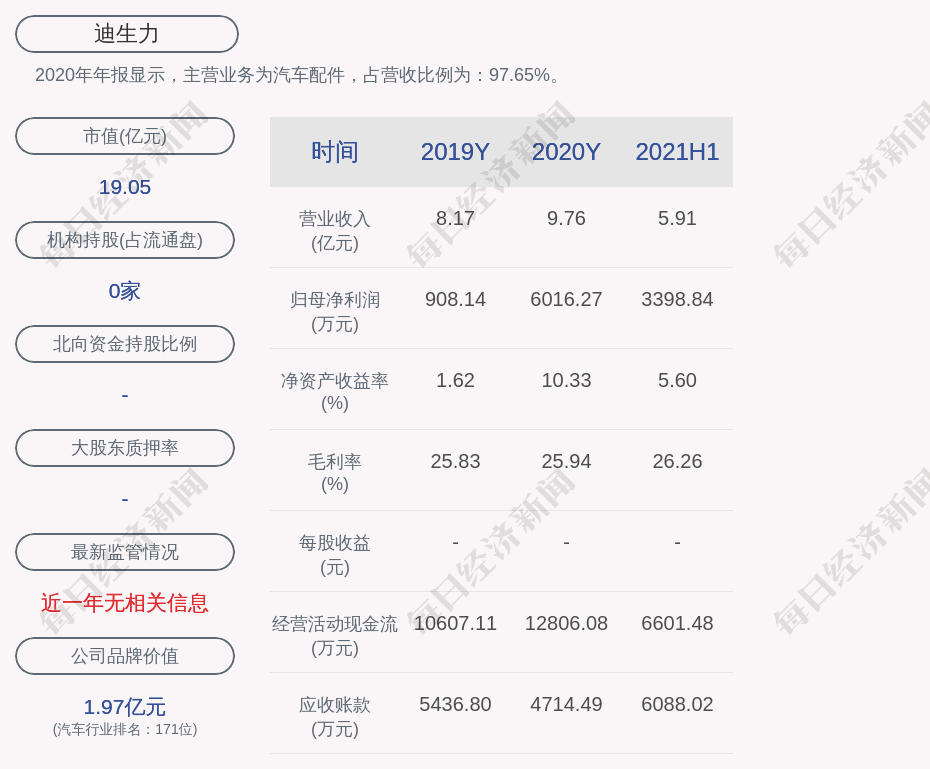 2020年年报显示,迪生力的主营业务为汽车配件,占营收比例为:97.65%。