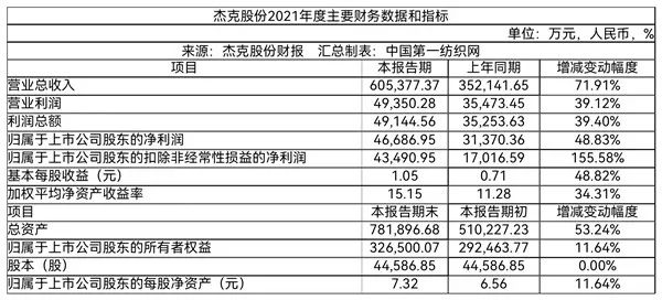 杰克缝纫机股份有限公司(以下简称“杰克股份”)近日披露2021年业绩快报,报告期内,公司实现营业收入为60.53亿元,比上年同期增长71.91%,归属于上市公司股东的净利润为4.66亿元,比上年同期增长48.83%。