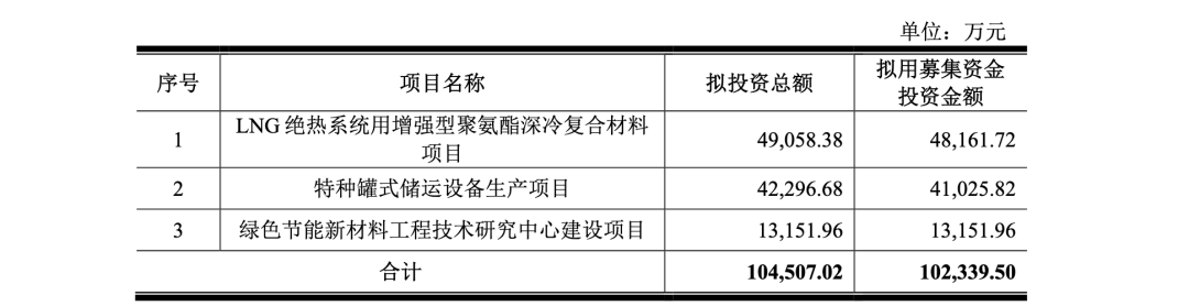 本次募投的另一项重头戏是“LNG绝热系统用增强型聚氨酯深冷复合材料项目”,该项目拟投资总额为4.91亿元,预计达产后将新增产能16,052吨。